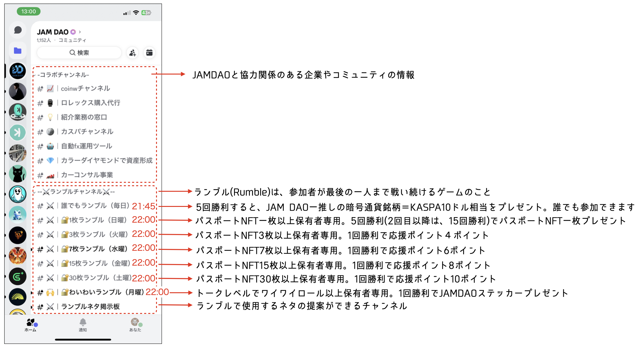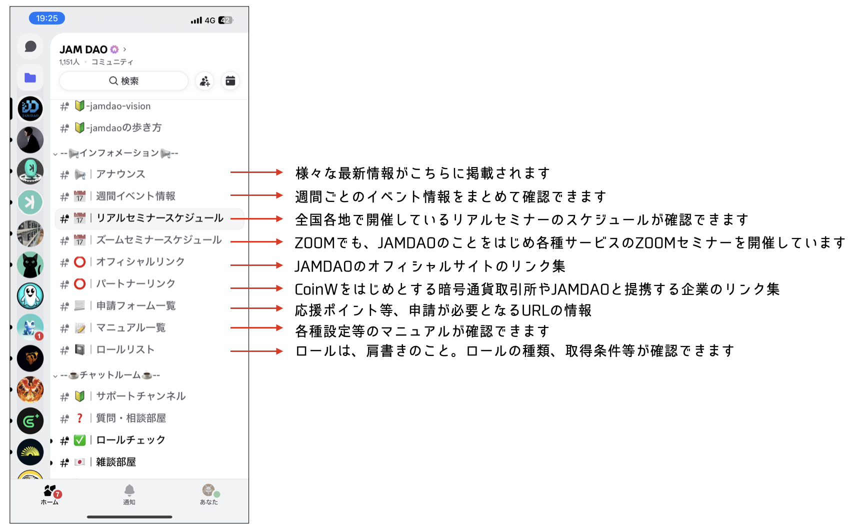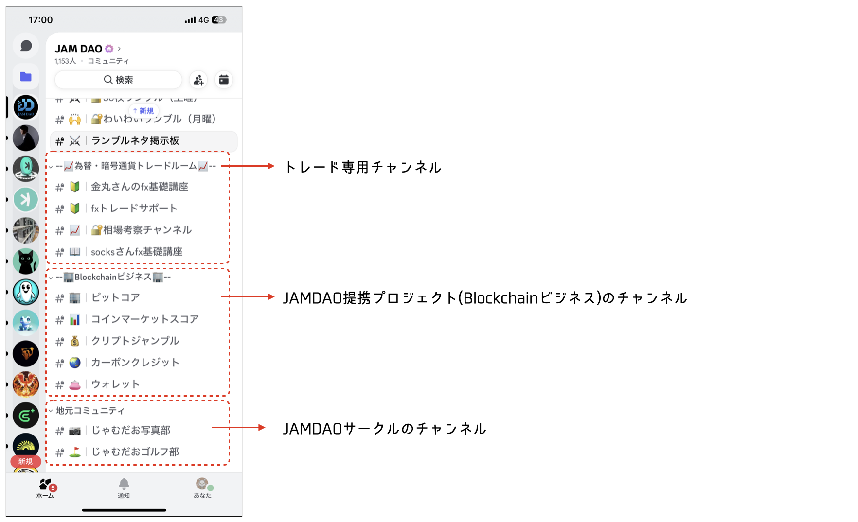 JAMDAOサーバーとは、Discordを使って構築したJAMDAOのプラットフォームであり、その中にカテゴリーがあり、カテゴリーの中にチャンネルが構成されています。