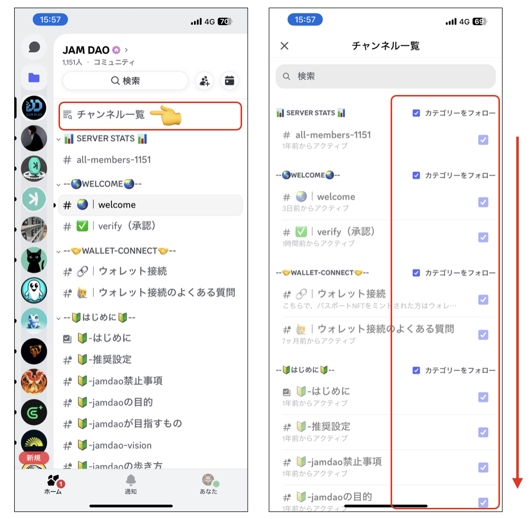 「チャンネル一覧」を選択し、☑️各カテゴリーをフォローします。
