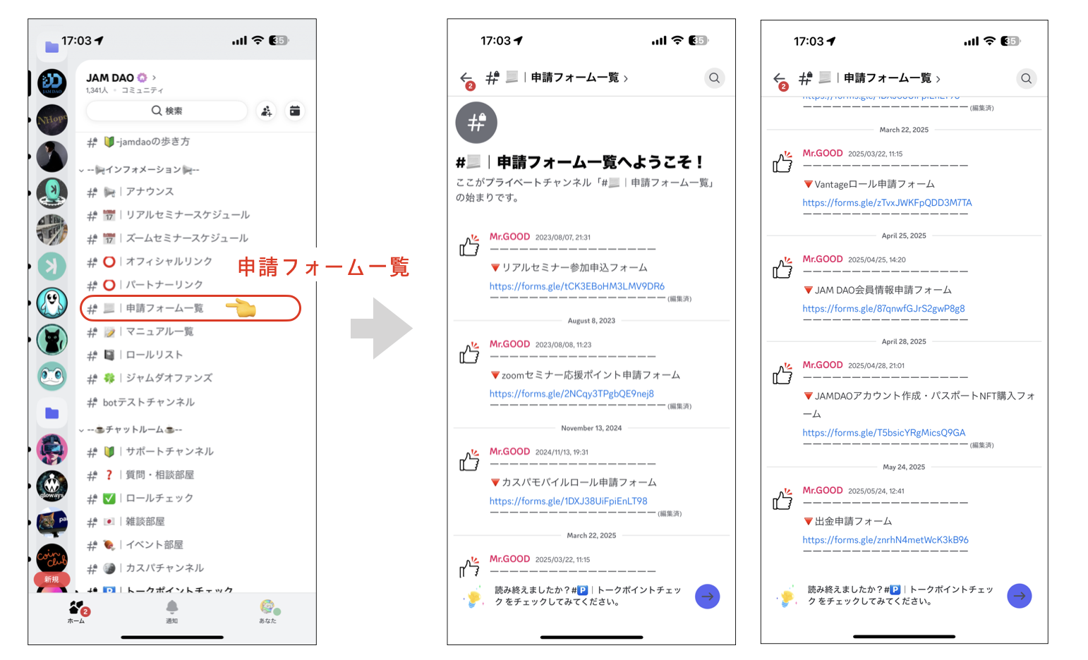 申請でわからなくなったら、「申請フォーム一覧」チャンネルにアクセスれば、解決します。