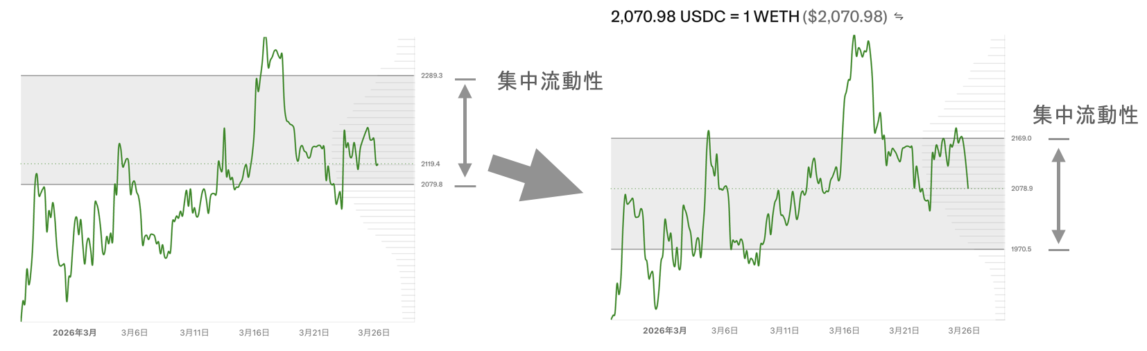 「今の価格が1ETH=2,000ドルなら、1,500ドル〜2,500ドルの間だけで私の資金を使っていいよ!」と範囲(集中流動性)を指定するものです。