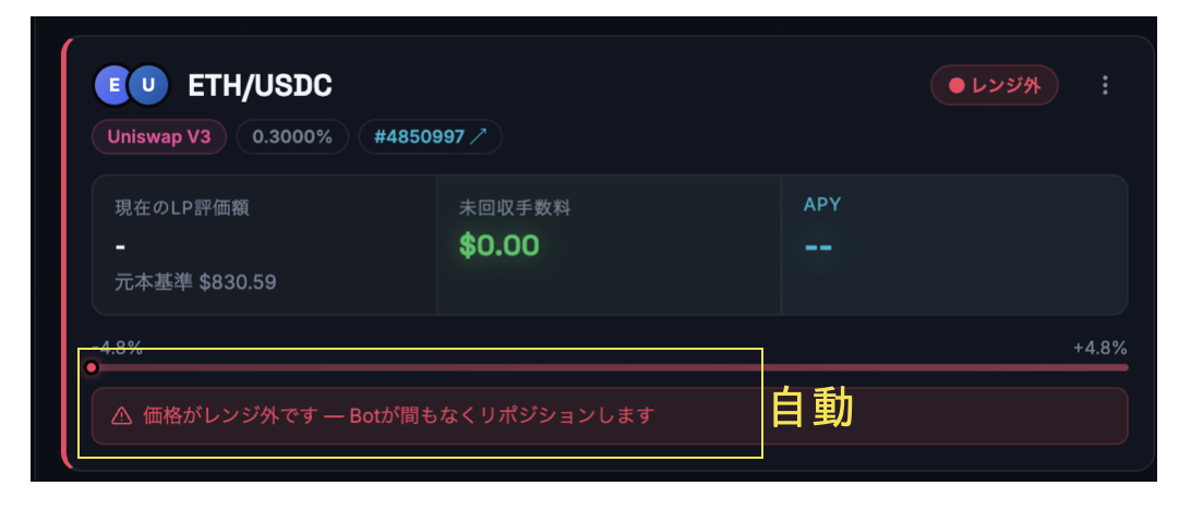 価格が急変してレンジ外になっても、すぐに最適な位置へLPを移動させてくれるため、手数料収入が途切れる時間を最小限に抑えられます。