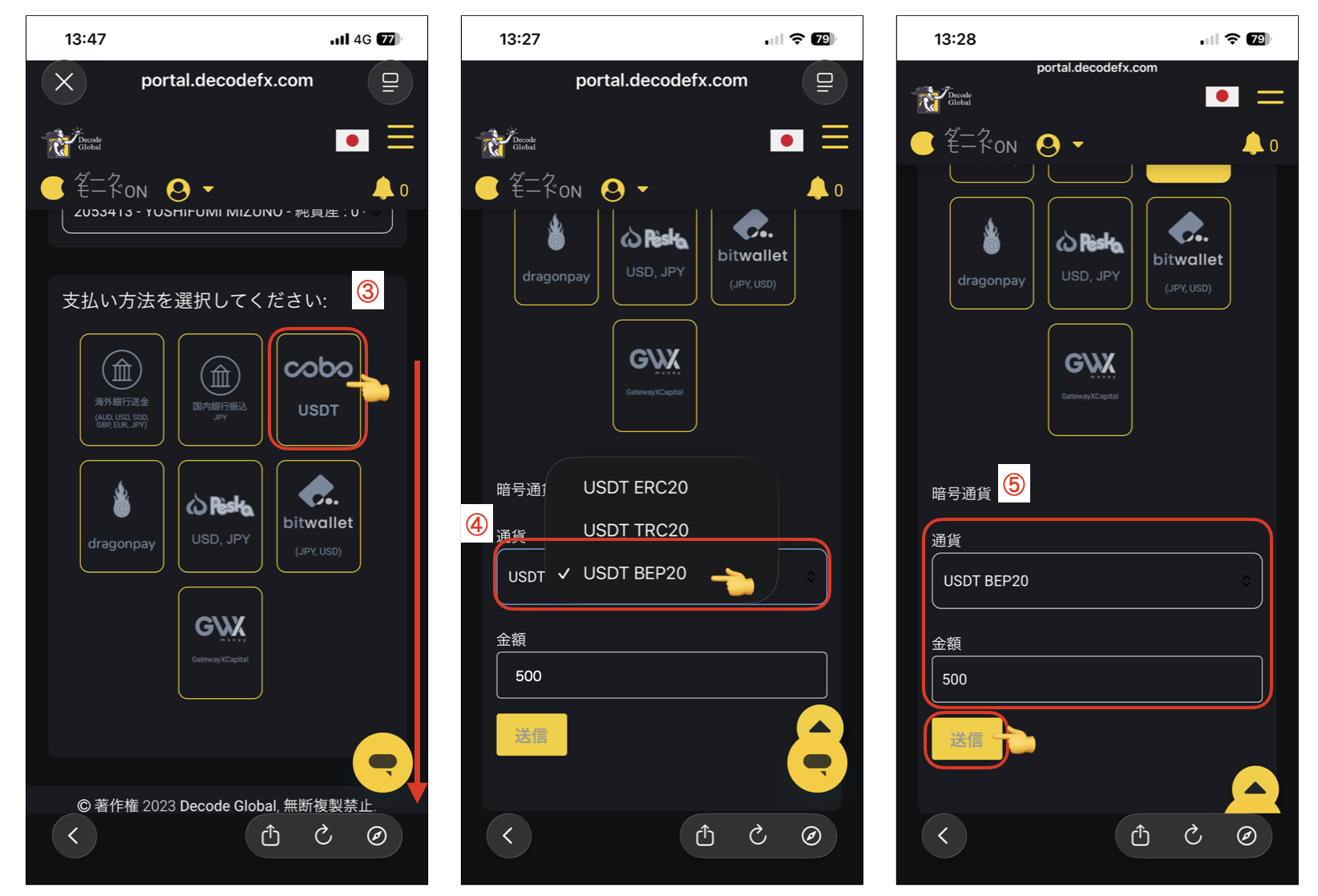 ここでは運用資金として、「USDT(ユーエスディーティー)」を入金する例を書きます。