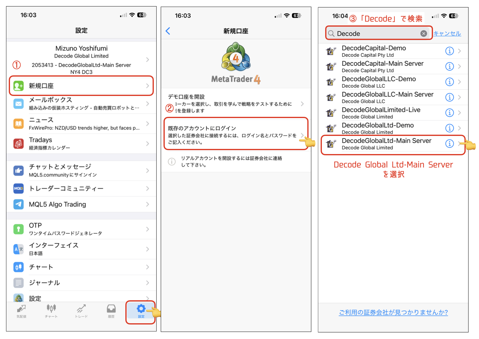 「Decode」で検索して、候補の中から「Decode Global Ltd-Main Server」を選択、タップします。