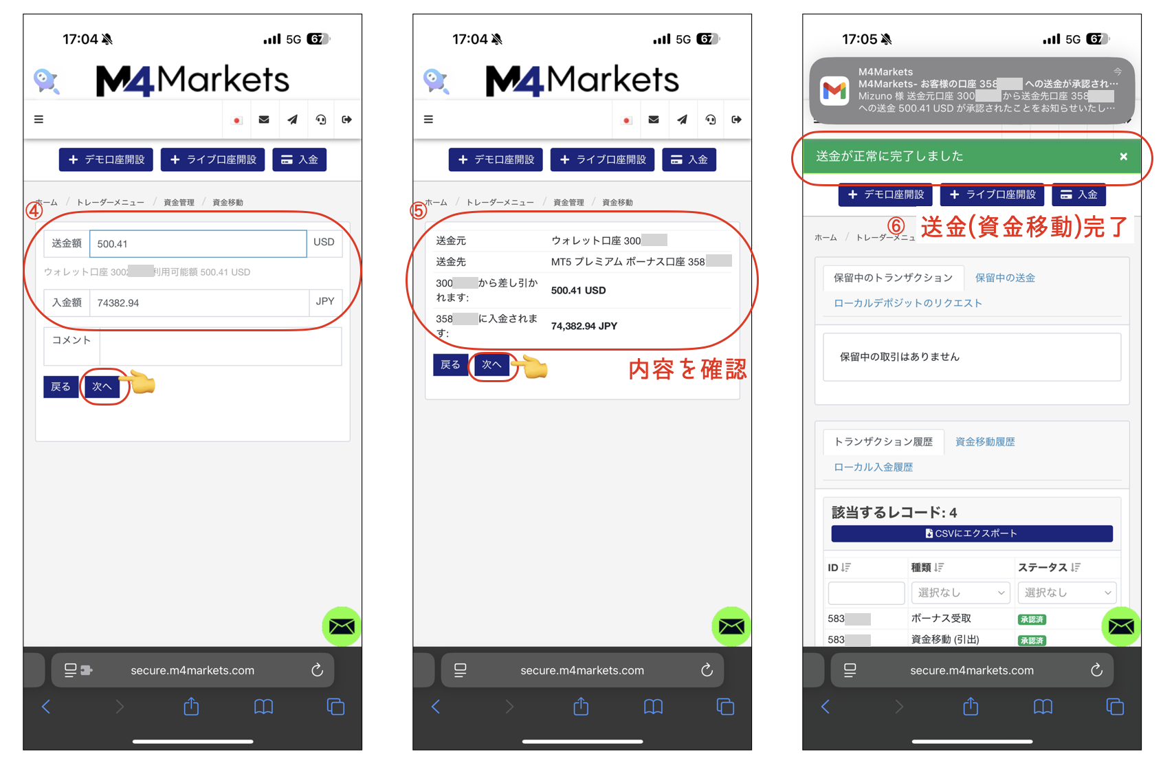 ④送金額、入金額の確認