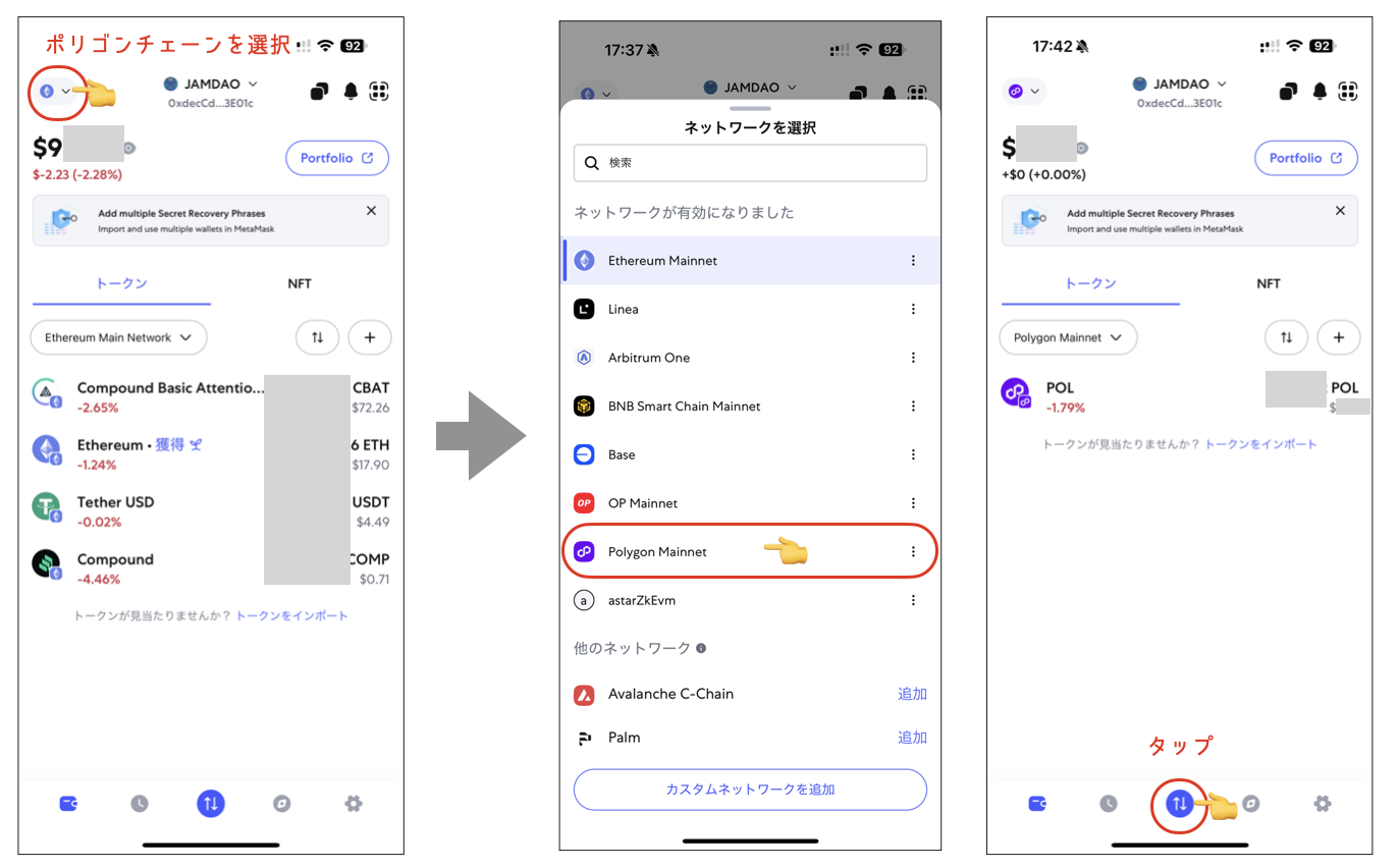 ・メタマスクでポリゴンチェーン(Polygon Mainnet)を選択します。