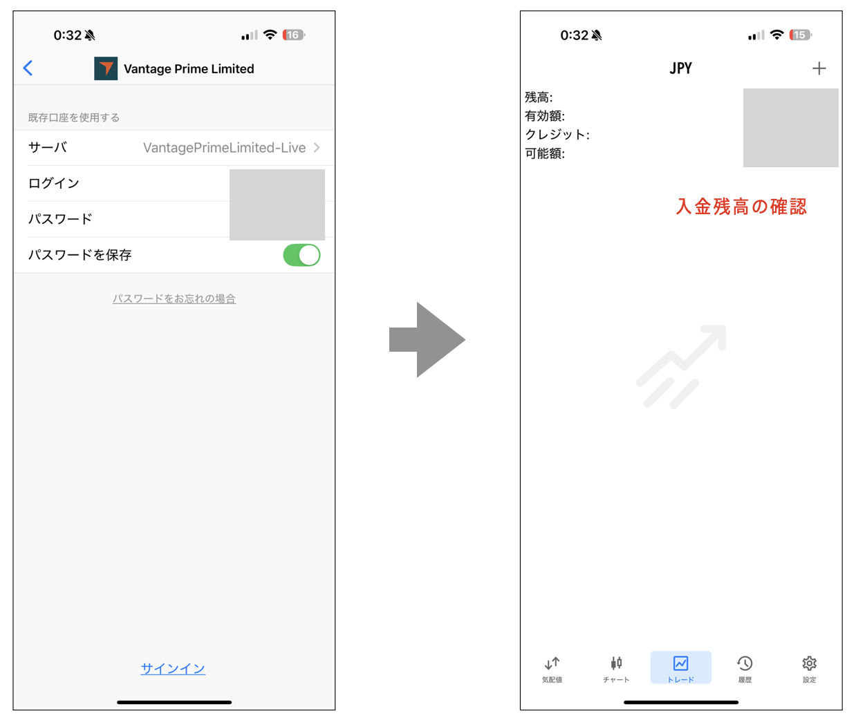 Vantage Tradingに入金した残高と合致しているか、確認します。
