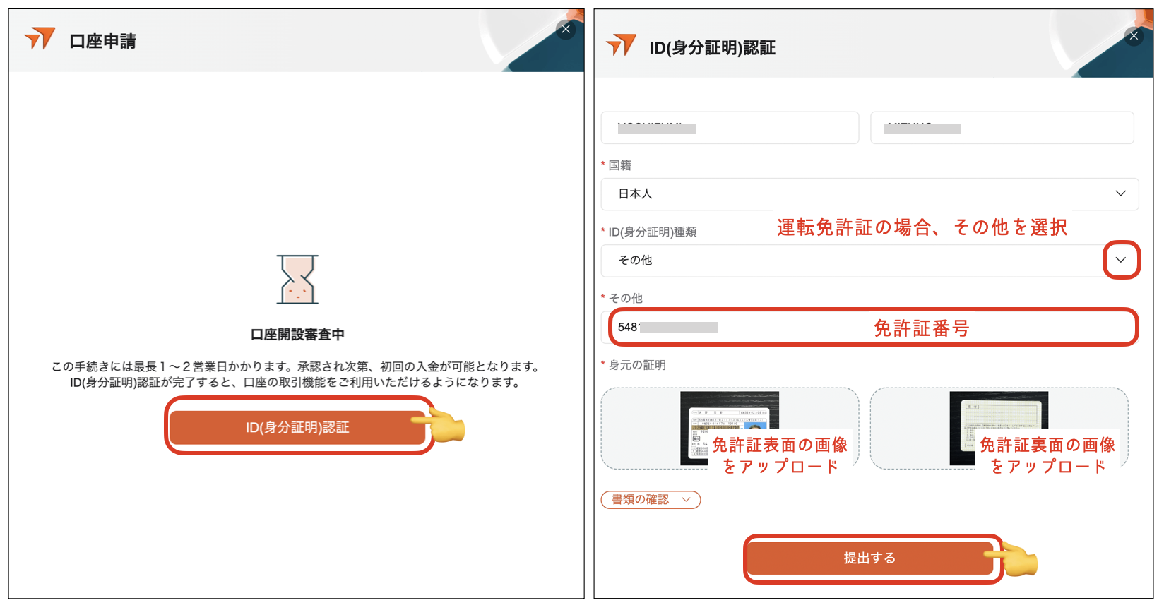口座設定が終わったら、ID(身分証明)認証へ進みます。
