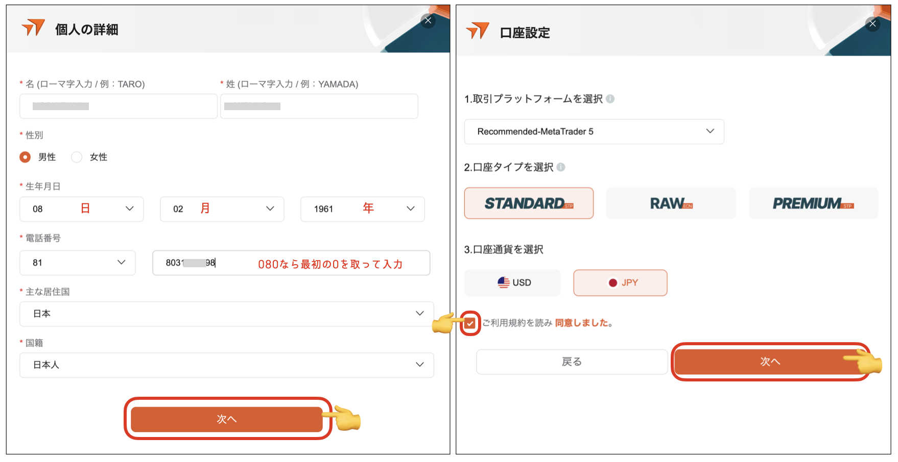 個人の詳細と口座設定