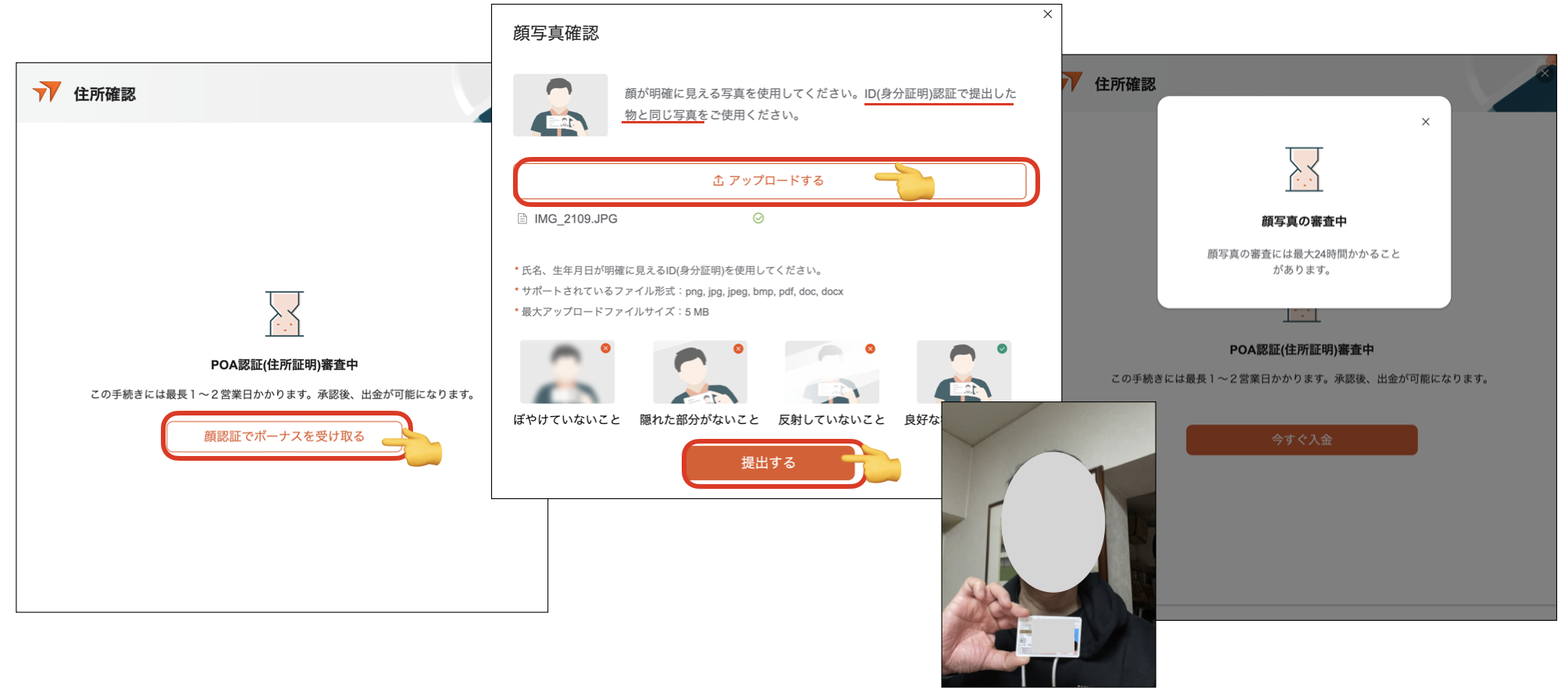 1、ID(身分証明)認証で提出した時と同じもの(今回は運転免許証)を持って撮影、提出