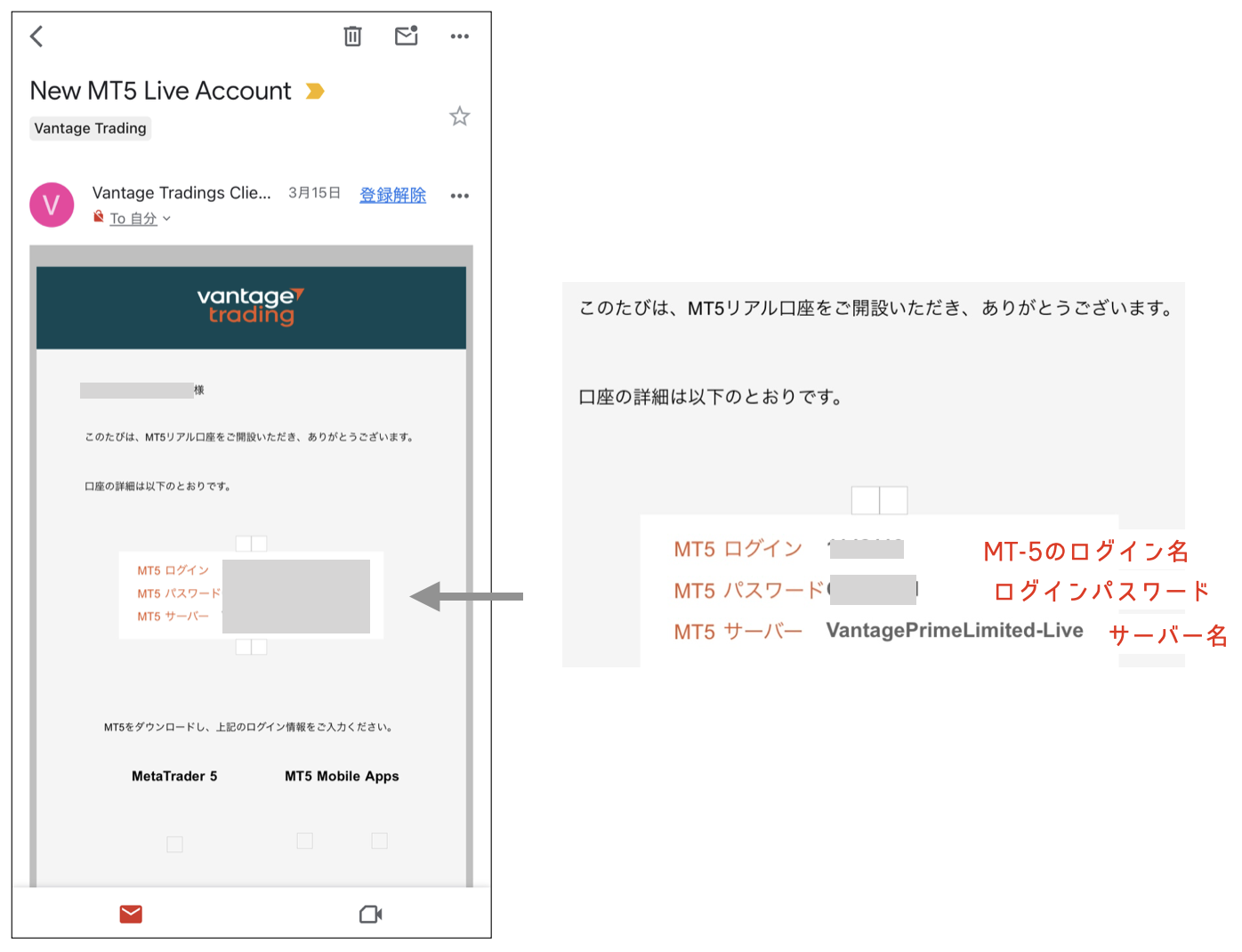 Vantage Tradingの口座登録をすると、登録メールに「MT5」の口座情報が届きます。